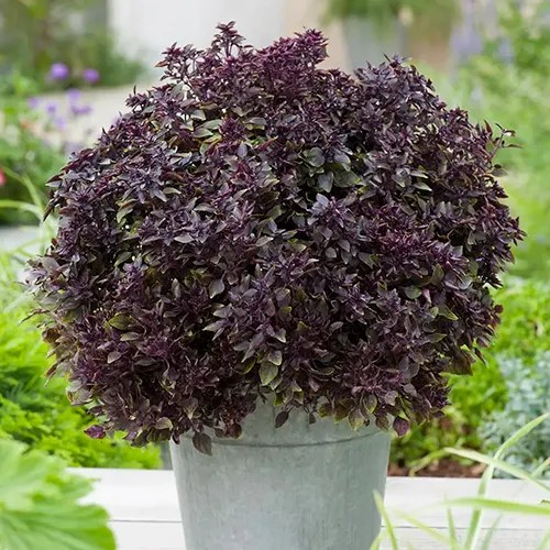 Le Basilic pourpre ‘Purple Ball’, une variété unique avec une forme ronde et touffue, paré de feuilles et de fleurs pourpres, agréable en cuisine comme au jardin.